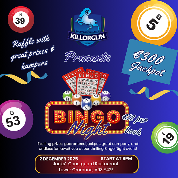 Join us on 2nd December 2025 for a fantastic evening of Bingo with great prizes up for grabs including a โฌ300 guaranteed Jackpot!!